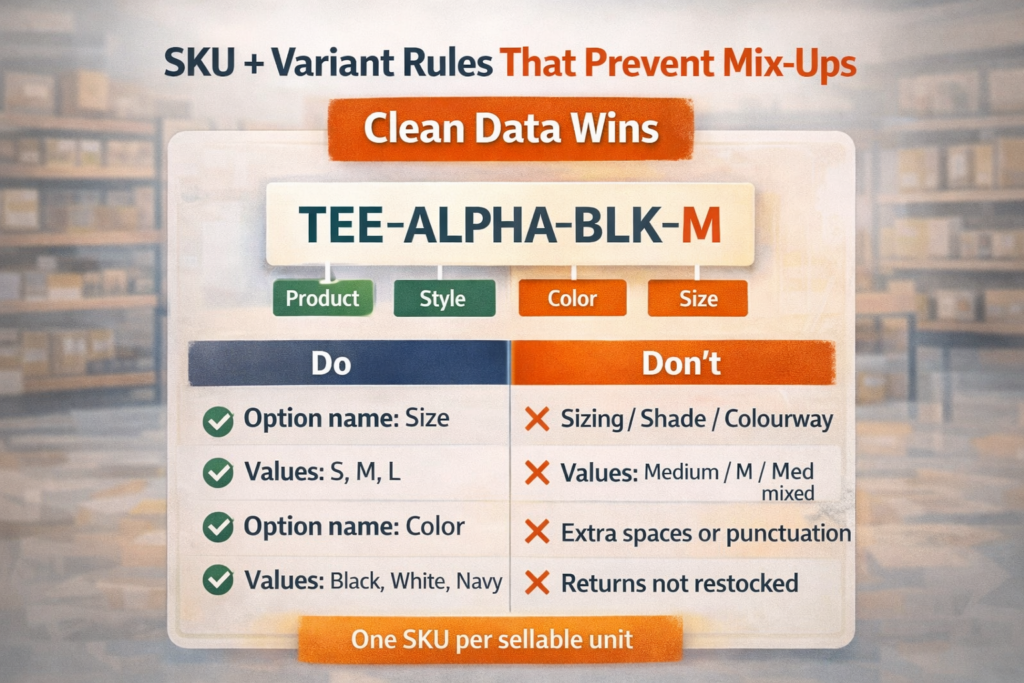 The inventory basics Shopify store owners must get right first (SKUs, variants, and naming rules)